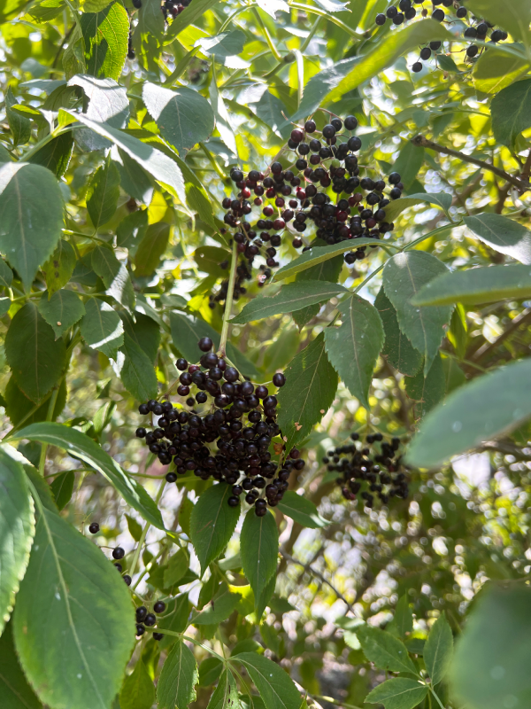 Our American elderberry (Sambucus Canadensis) bushes have gotten much larger this year and are currently covered with fruit. The American elderberry is a native shrub which can reach grow up to 12' high and will spread over time. Because of these characteristics, it makes an effective privacy screen or windbreak on your property. Large white flowers bloom in June and July, giving way to drooping clusters of small black berries in July and August. The flowers provide nectar for butterflies and other insects. Ripe berries are eaten by birds such as robins, bluebirds, catbirds, and cardinals, as well as small animals like squirrels and turtles.