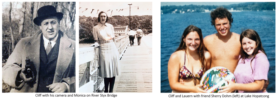 On July 16, 1934, Monica Schloesser, from Brooklyn, came by train to visit the lake with a friend for a girls’ weekend. The two found themselves at The Mad House, purported to be the wildest place on the lake. There, she met Cliff. He offered to take her photo out on the dock. A press photographer at that time, he hoped he could get the photo published in an NYC newspaper (at least, it was a clever line)!