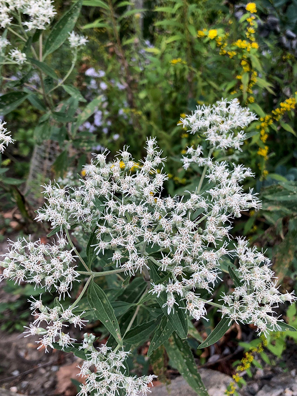With fall upon us, it is great to see so many blooms still in our native gardens. As many of the plants die back, three varieties are excelling this year. In bloom right now are at least four types of asters, nice spreads of goldenrod, and a sprinkling of white boneset. We have noticed many pollinators enjoying this late source of food and the asters, in particular, are attracting goldfinches. As you start thinking about which native plants to add next year, perhaps consider some of these late-blooming varieties to give your garden color until frost and provide an important food source.